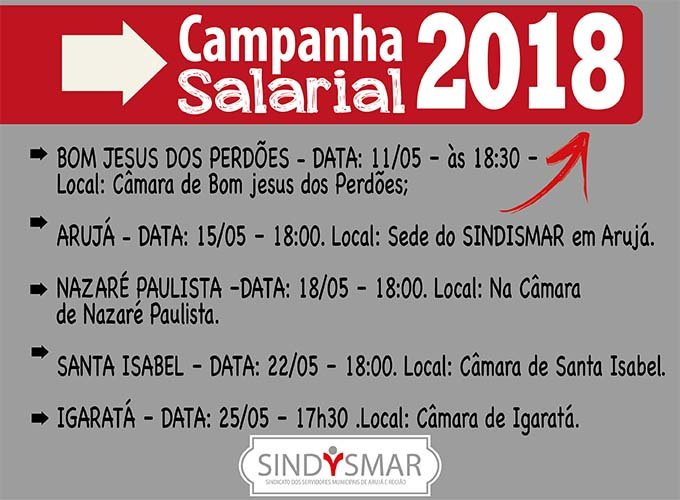 O SINDISMAR vem informar a todos os Servidores Municipais de Arujá, Bom Jesus dos Perdões, Igaratá, Nazaré Paulista e Santa Isabel, que as assembleias de Pauta de Reivindicações acontecerão no mês de maio para que as reivindicações possam ser incluídas nas peças orçamentárias das Prefeituras.