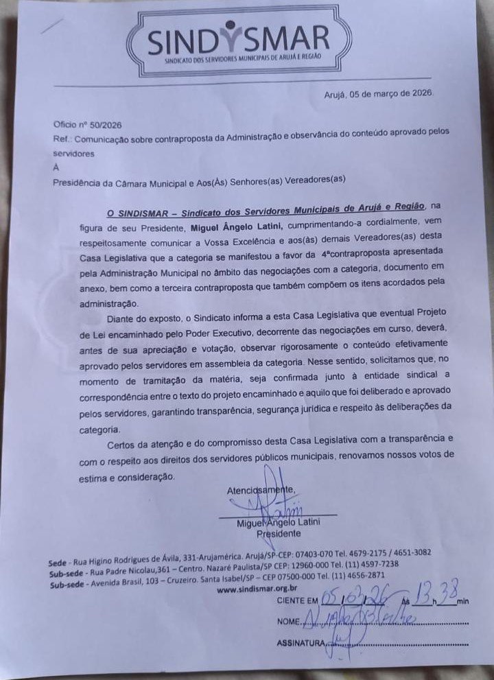Foi oficialmente protocolada nesta quinta feira 05/03/26, na Câmara Municipal e na Prefeitura, a aprovação da contraproposta enviada pelo Governo.